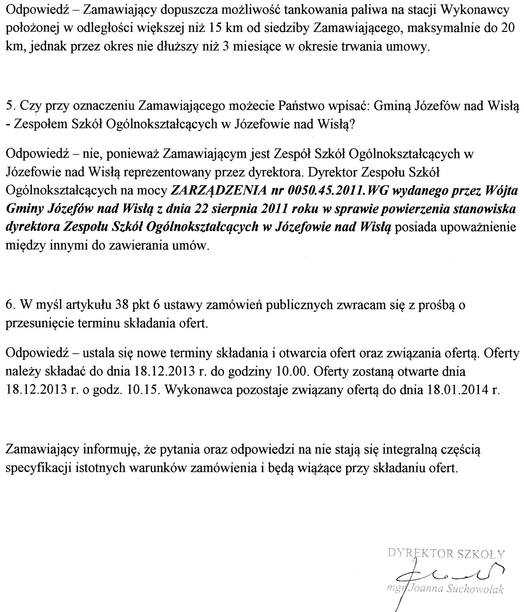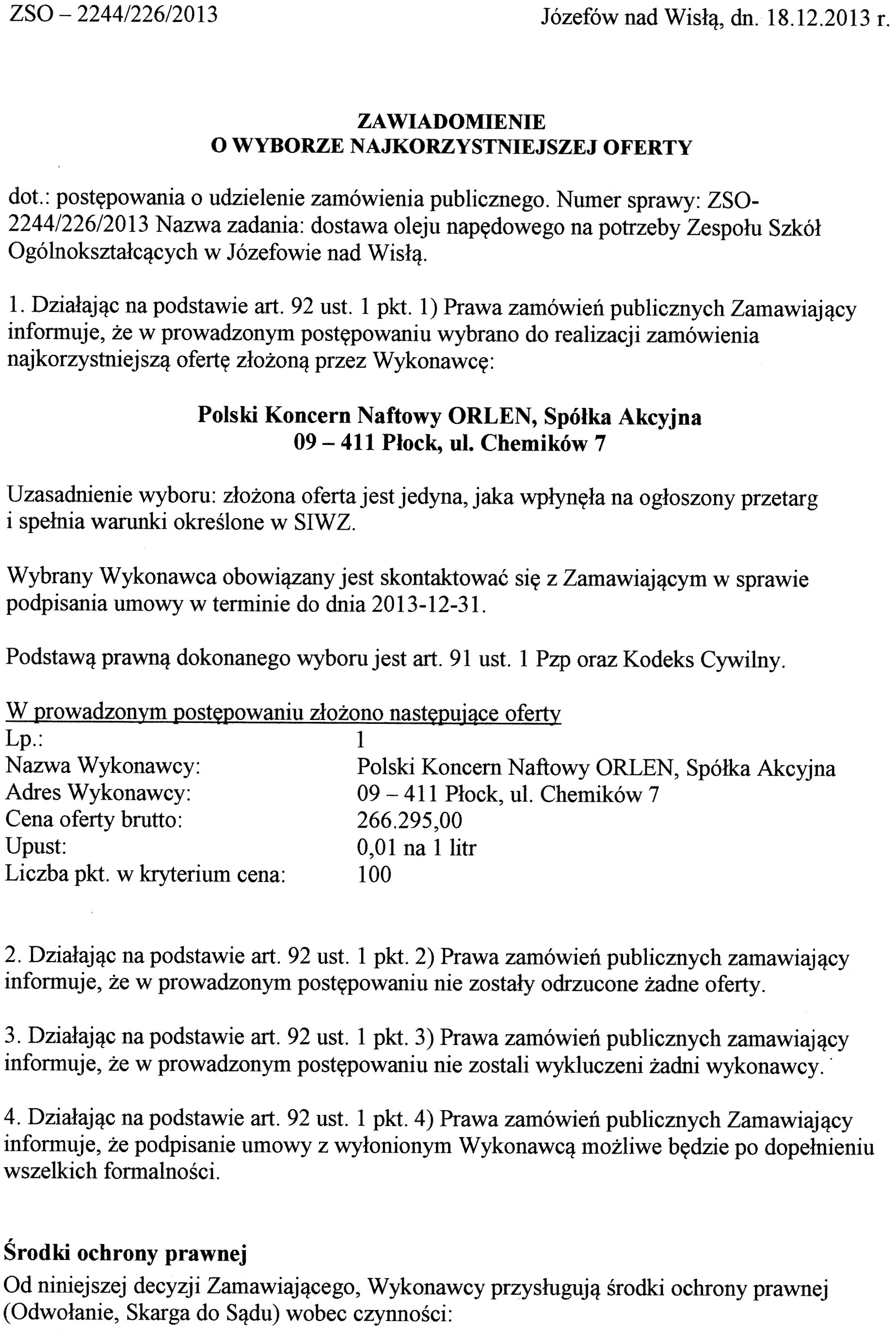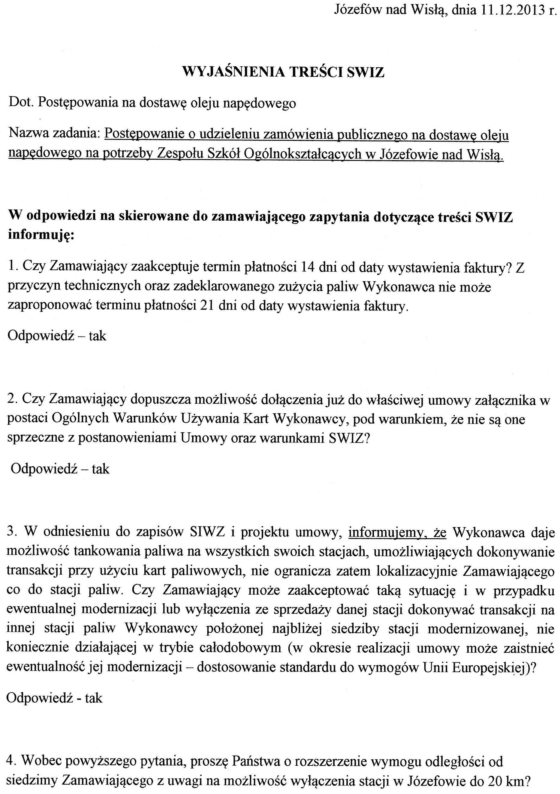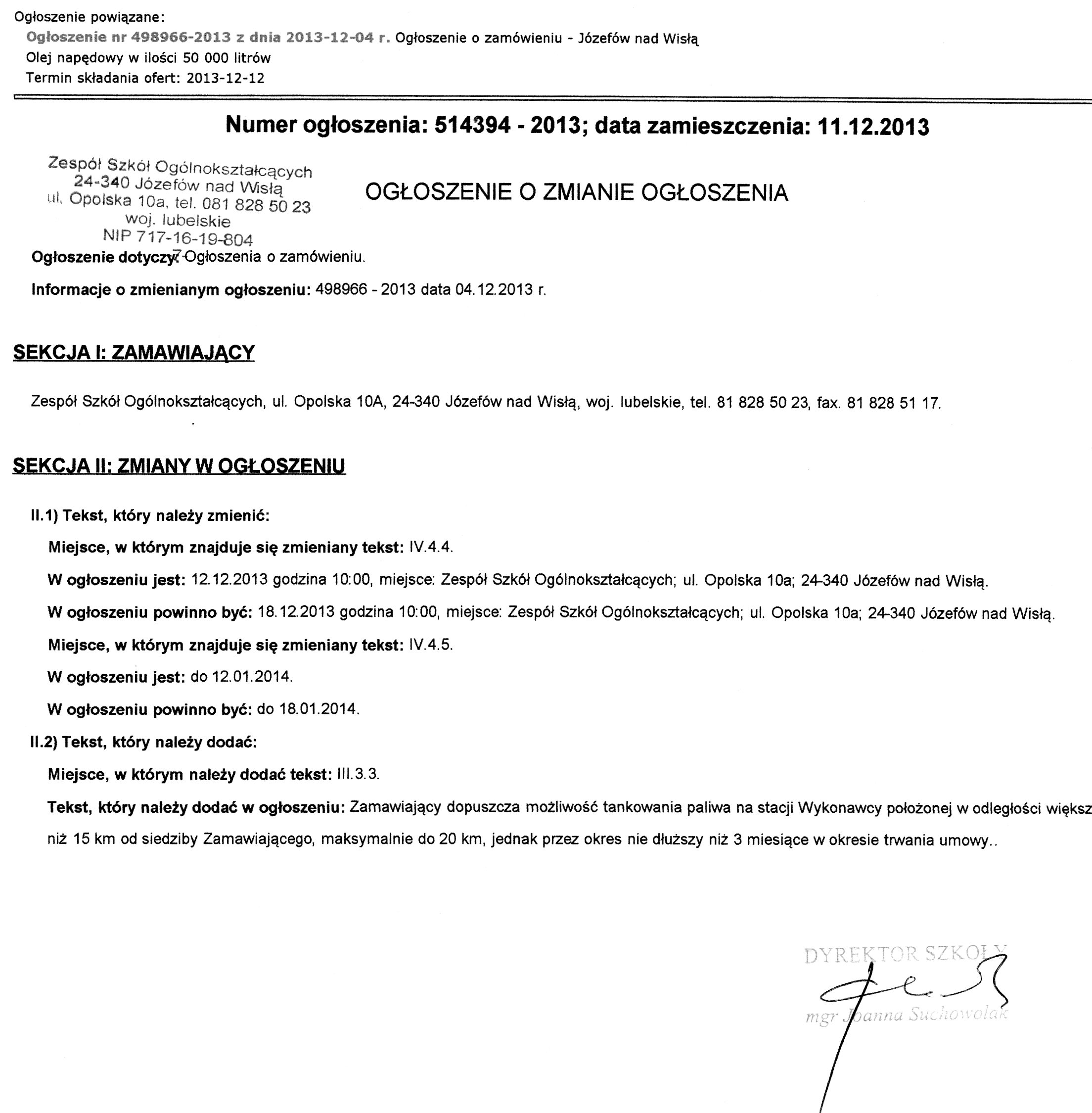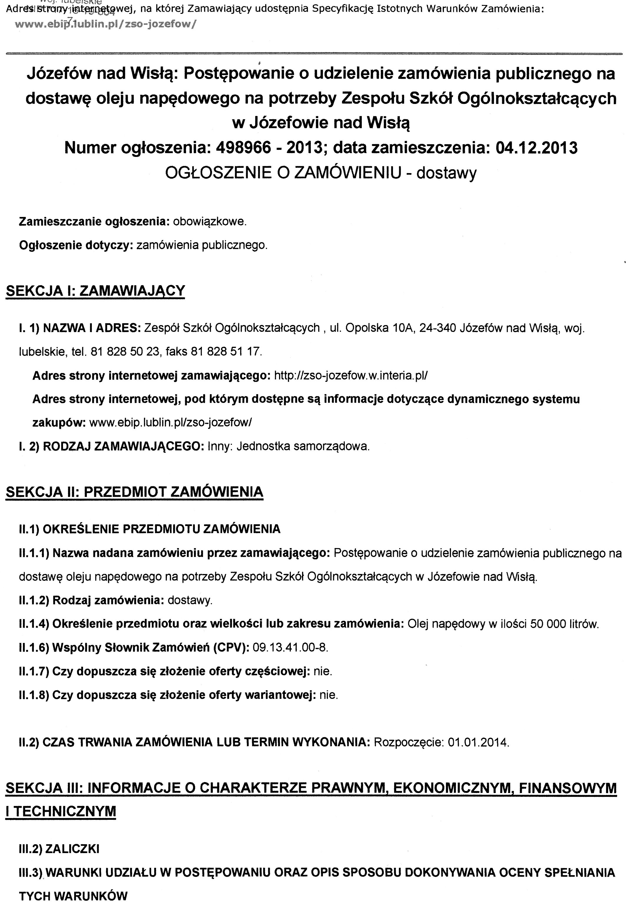 powrót do listy przetargówPostępowanie o udzielenie zamówienia publicznego na dostawę oleju napędowego na potrzeby Zespołu Szkół Ogólnokształcących w Józefowie nad Wisłą.
